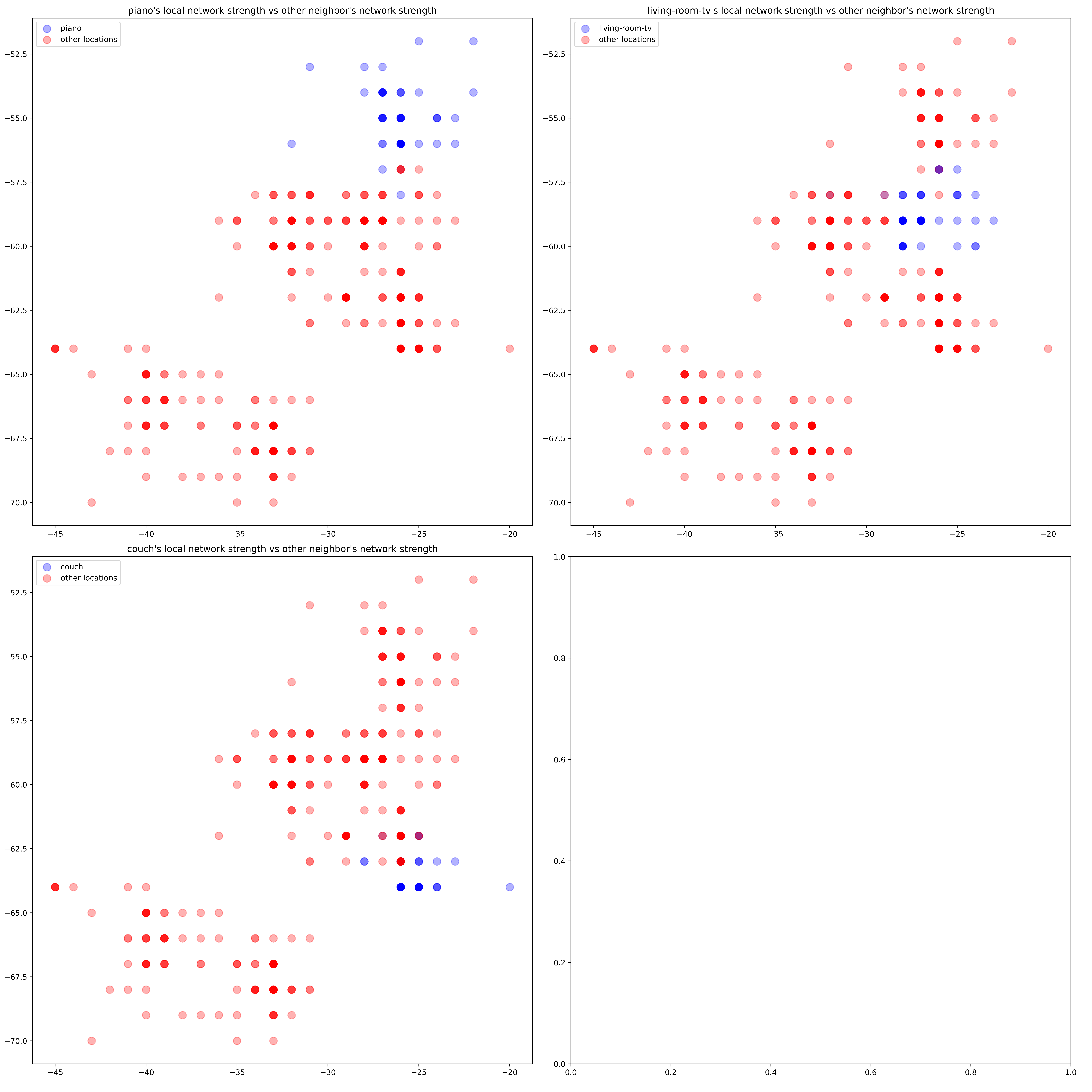 Unfortunately, the same cannot be said for all of the measured locations. For example, the red area (piano) and the dark blue area (living room TV) have significant overlap, and I would need data from more networks to distinguish between them.