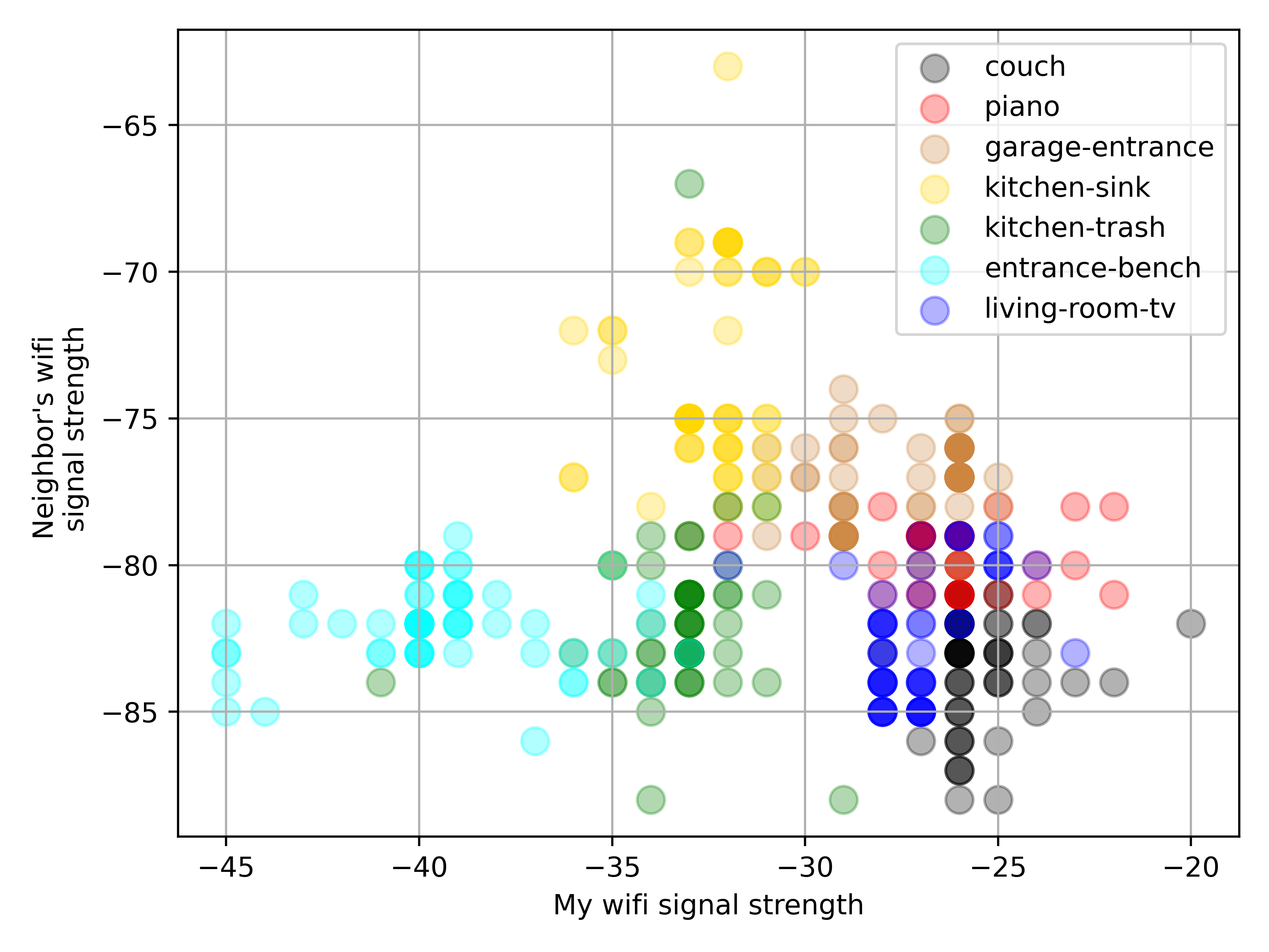 Tada! While my laptop could detect about 10 networks, I am only showing data for two of them for the sake of visualization. The x-axis displays my network’s RSSI’s, and on the y-axis shows my neighbor’s network’s RSSI’s. We would hope to see that each color cluster is clearly separate from the clusters. In fact, the light blue (entrance), bench (garage entrance), and yellow (kitchen sink) areas do seem to be fairly distinct. It’s reasonable to conclude that there exists a machine learning algorithm to differentiate between these locations.